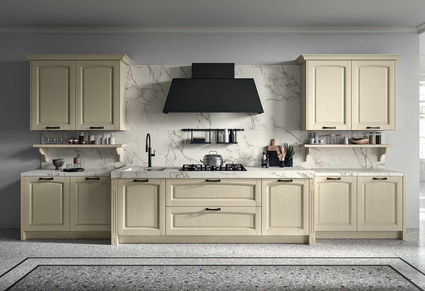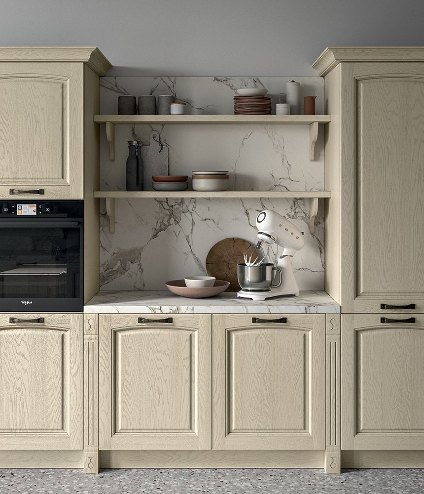 Arredo3 definisce con Emma una cucina classica raffinata che coniuga stile e praticità. L’anta a telaio è in massello di castagno o di frassino laccato decapè, disponibile anche con inserto in vetro decorato per dare movimento e lustro alla composizione. All’impronta senza tempo della tradizione, Emma abbina la propensione a ideare ambienti solidi e funzionali accessoriati in modo pratico e attuale, pensati per soddisfare le esigenze contemporanee. Emma è classicità raffinata con soluzioni pratiche e solide.