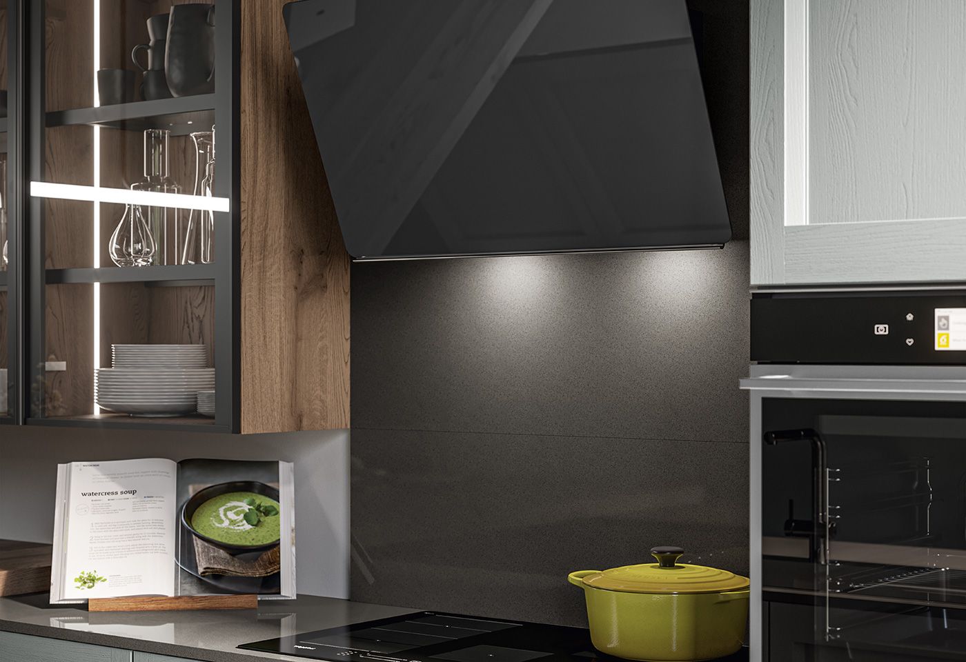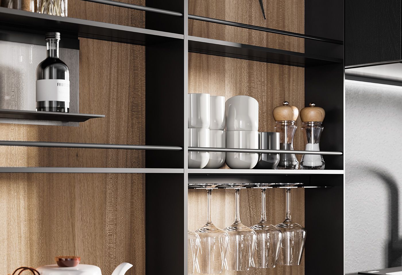 Frida di Arredo3 è una cucina estremamente versatile grazie a finiture trasversali e complementi dedicati, come i supporti in metallo per i ripiani,