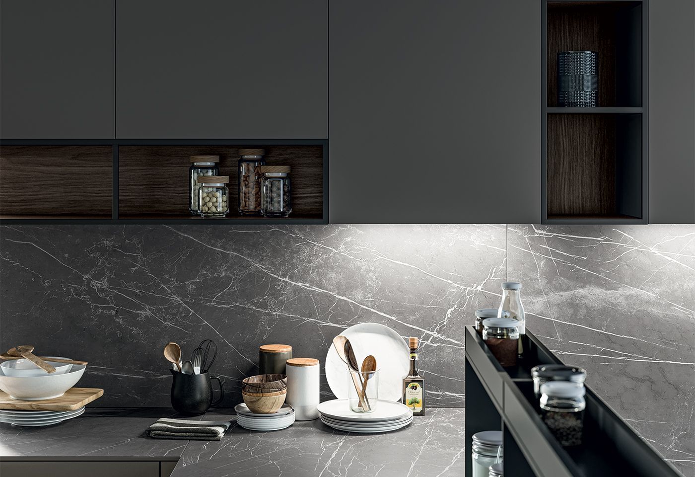 Lo fa nell’anta, nella quale con un espediente tecnico incava il pannello e lo sovrasta con un listello in metallo così presa e apertura sono confortevoli. Lo fa con la pratica selezione dei materiali, come PET 100% riciclabile e laminati che rendono il calore di legni e pietre: sono più comodi da usare e facili da pulire. Per chi apprezza l’abilità, in generale e nei dettagli.
